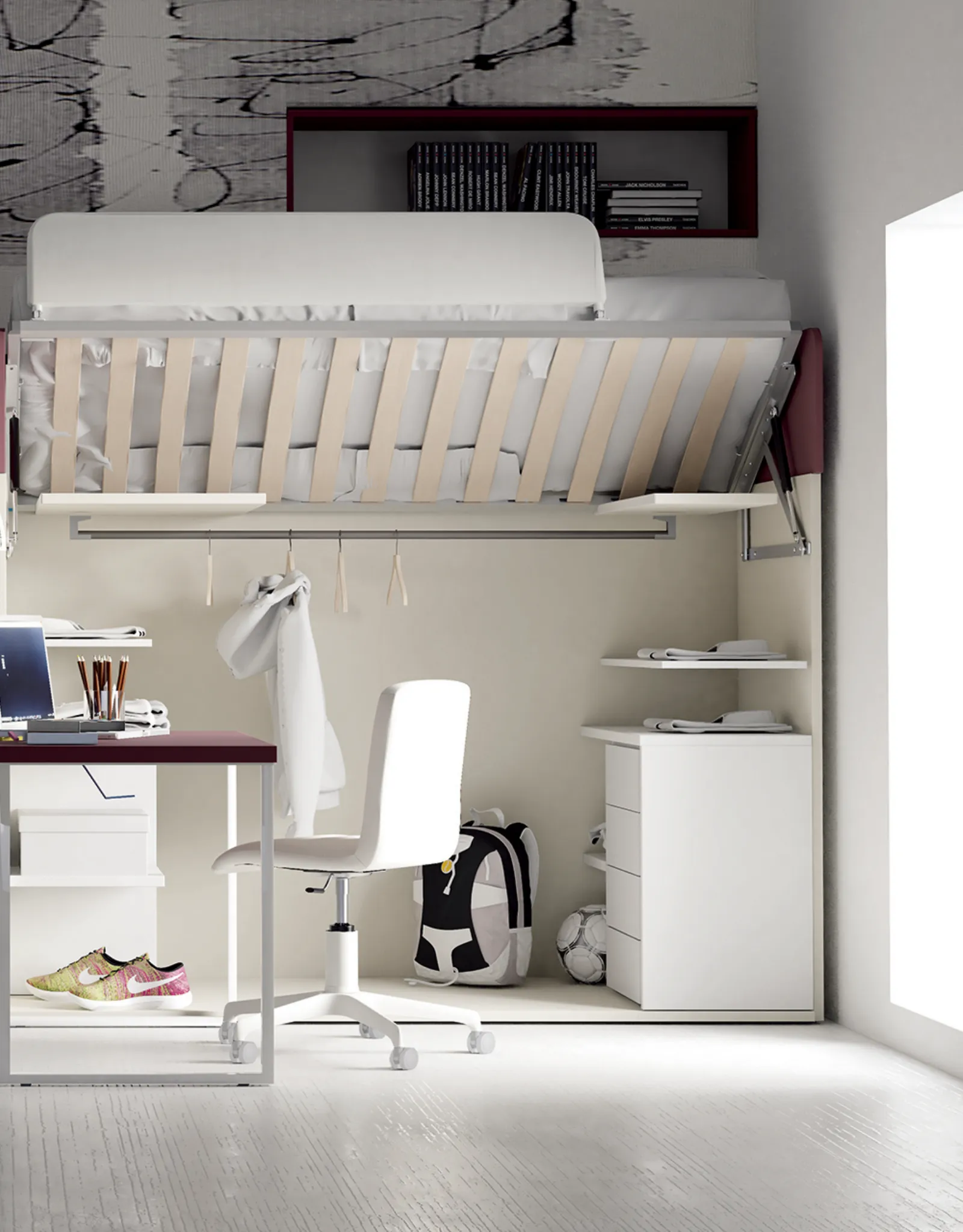 Un progetto con doppio Container, che unisce in un’unica soluzione letto, contenitore attrezzato e cabina armadio. A quest’ultima si accede con facilità alzando la rete del letto. Vi si possono poi abbinare altri elementi, per completare la cameretta con tutto il necessario.